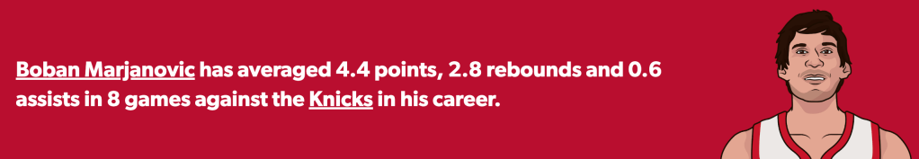Isiah Hartenstein– I could talk about how well Hart has been playing as of late. Or how natural he looked he putting up 8-6-6 on 100% shooting. But I’d rather focus on how he got tied up with Boban(!) and they walked up the court with Hart’s arm pinned under Boban’s. An Isiah Hartenstein vs Boban Marjanovich dust up was not on my pregame bingo card. On another Boban point, the announcer called Boban “a Knicks-Buster”. Pictured below you can find the averages from the Reggie Miller-esque Knicks-killer Boban Marjanovic.